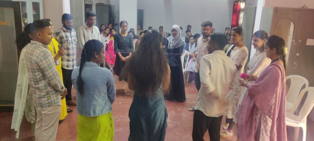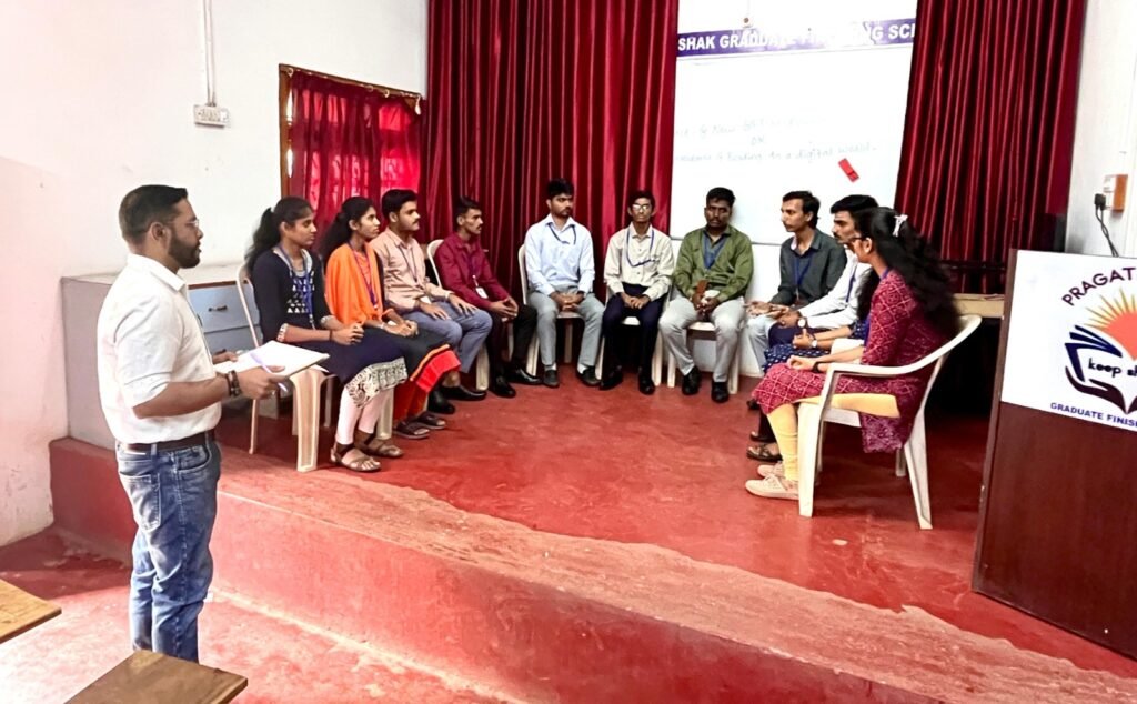 An interactive training session focused on communication, confidence building, and real-world workplace readiness at Pragati Poshak Graduate Finishing School.